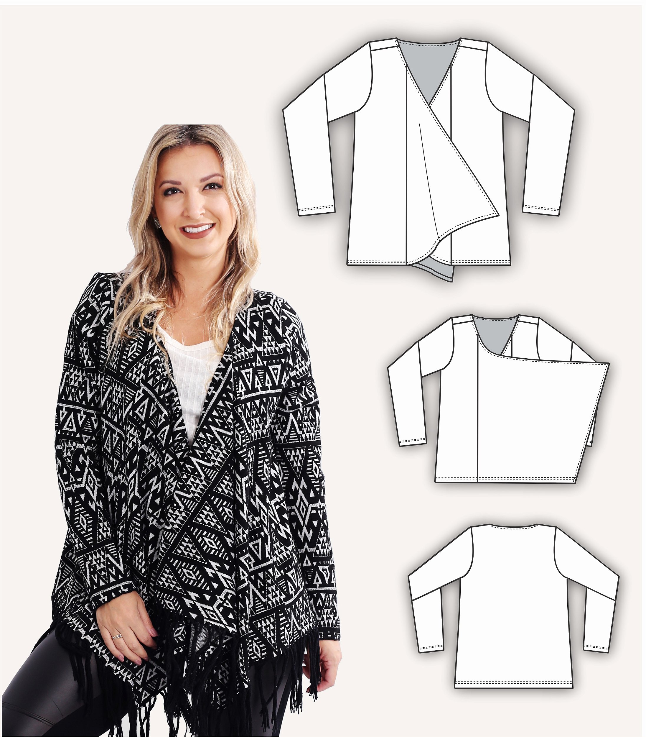 Descrição: Molde Cardigan. Decote com bainha 0,5 cm, mangas e barra com bainha 2,0 cm.